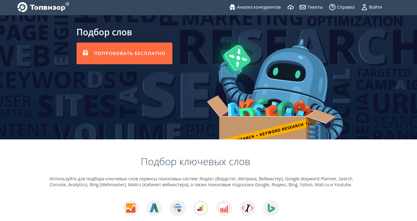 Популярный сервис, который позволяет собирать ключевые слова из Яндекс.Рекламы и других источников. Он предоставляет детальную статистику по ключевым словам, их частотности и конкурентности.