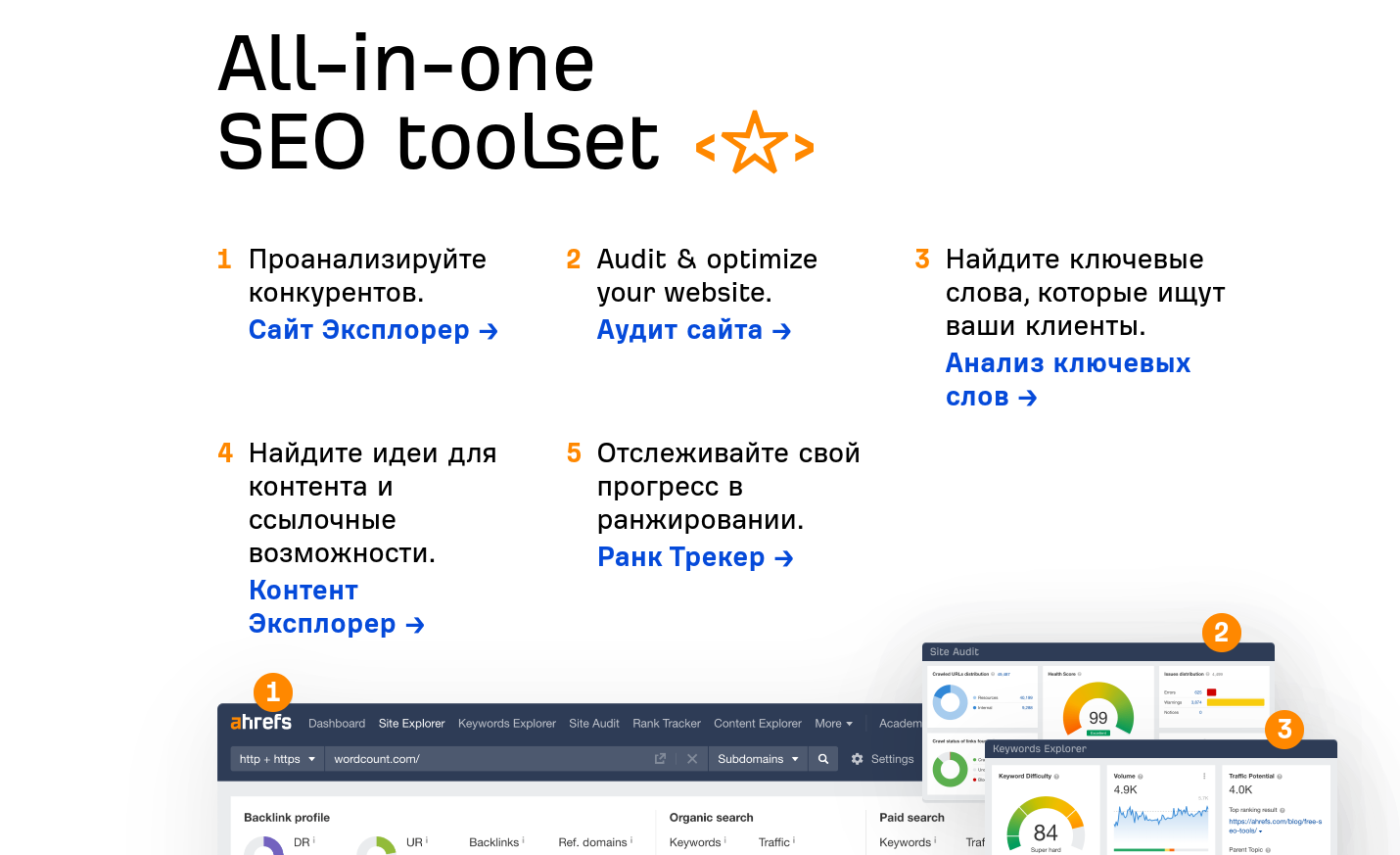 Еще один популярный инструмент SEO, предоставляющий набор функций для улучшения рейтинга вашего сайта в поисковых системах. Инструмент для исследования ключевых слов позволяет отыскать новые ключевые слова, проанализировать их объем поиска и конкурентоспособность.