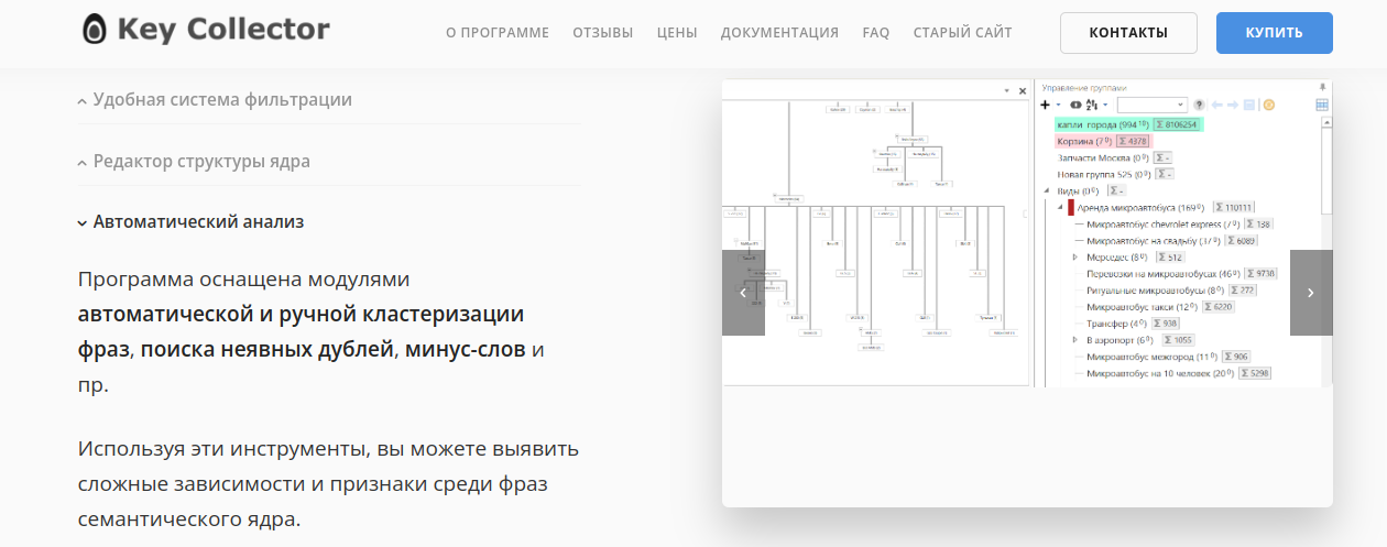 Это десктопная программа для работы с семантическим ядром: помогает собирать и расширять список ключевых запросов, кластеризовать их и быстро анализировать конкурентов в ТОП-10. Подойдет, если нужно не просто “собрать ключи”, а довести семантику до структуры и ТЗ на внедрение/контент.