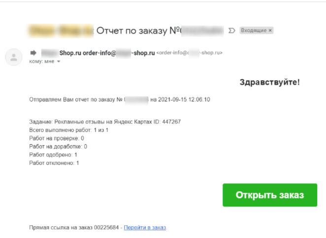 Был сделан тестовый заказ на размещение 1 отзыва.