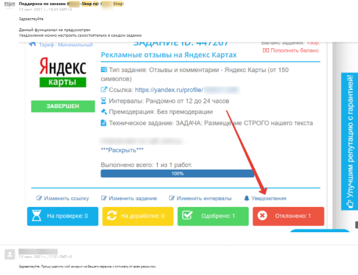 Через несколько дней отзыв сдался на проверку, но при этом на самих Яндекс.картах его не было. После нескольких отклонений (отправки на доработку) заказ всё равно упорно возвращался на проверку, как выполненный -