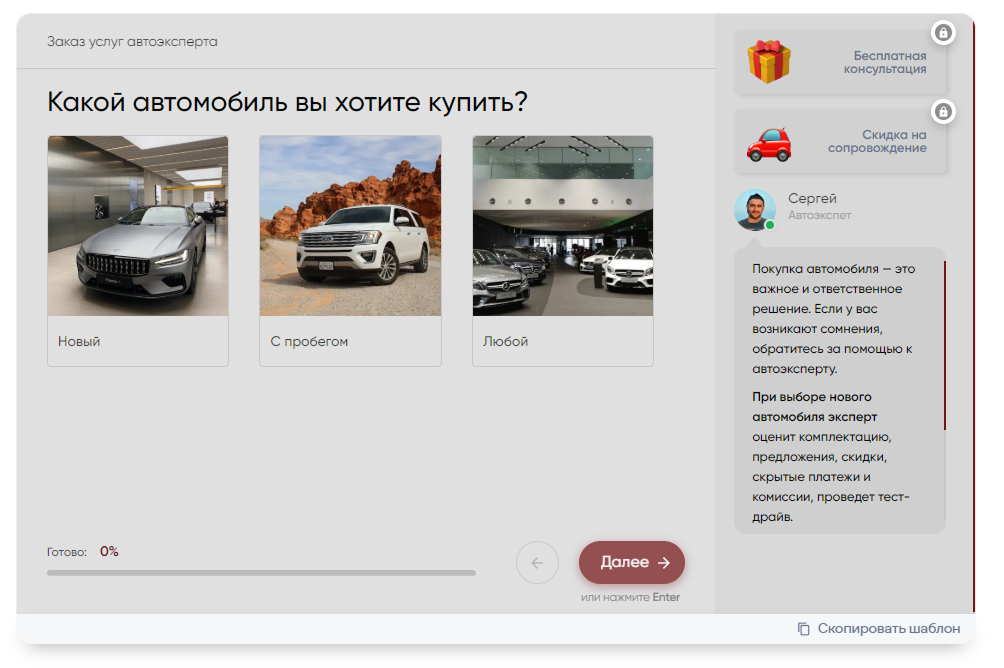 Иногда квиз это действительно удобно. В случае, когда у вас нет разработчика и вам не хочется платить деньги за еще один способ сбора заявок – вы можете без особых умений сделать квиз в конструкторе и в максимально простом режиме вставить его на абсолютно любой сайт.